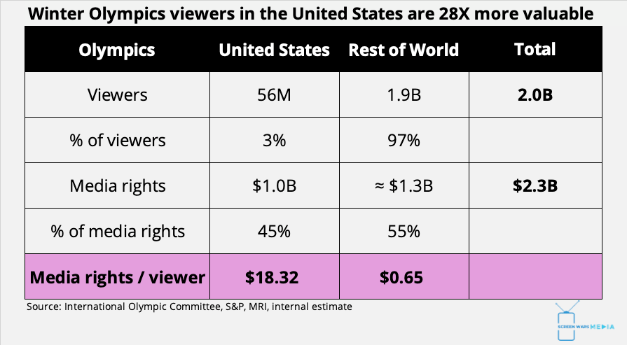 NBCUniversal will pay roughly $1B for U.S. rights to the 2026 Winter Games. The U.S. represents only 4% of the global population, yet accounts for roughly 45% of global media rights revenue.