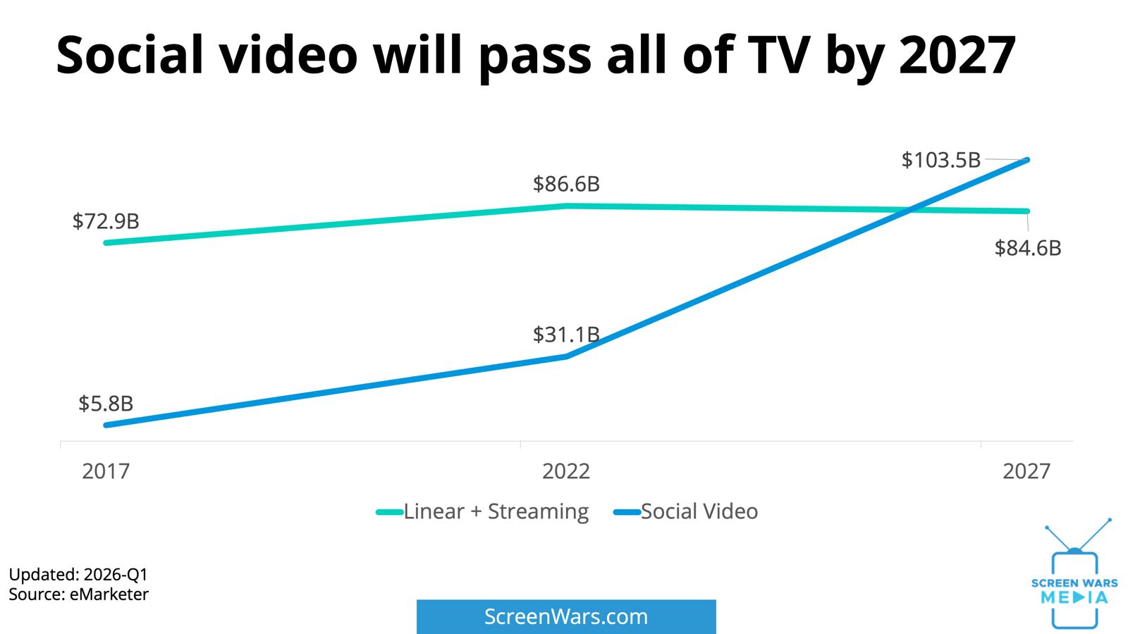 I still think social video can steal attention on streaming TV, but the platforms (Meta, TikTok, etc.) may not think it is worth the effort to fully commit. By 2027, American advertisers will spend more on social video than linear and streaming TV combined.