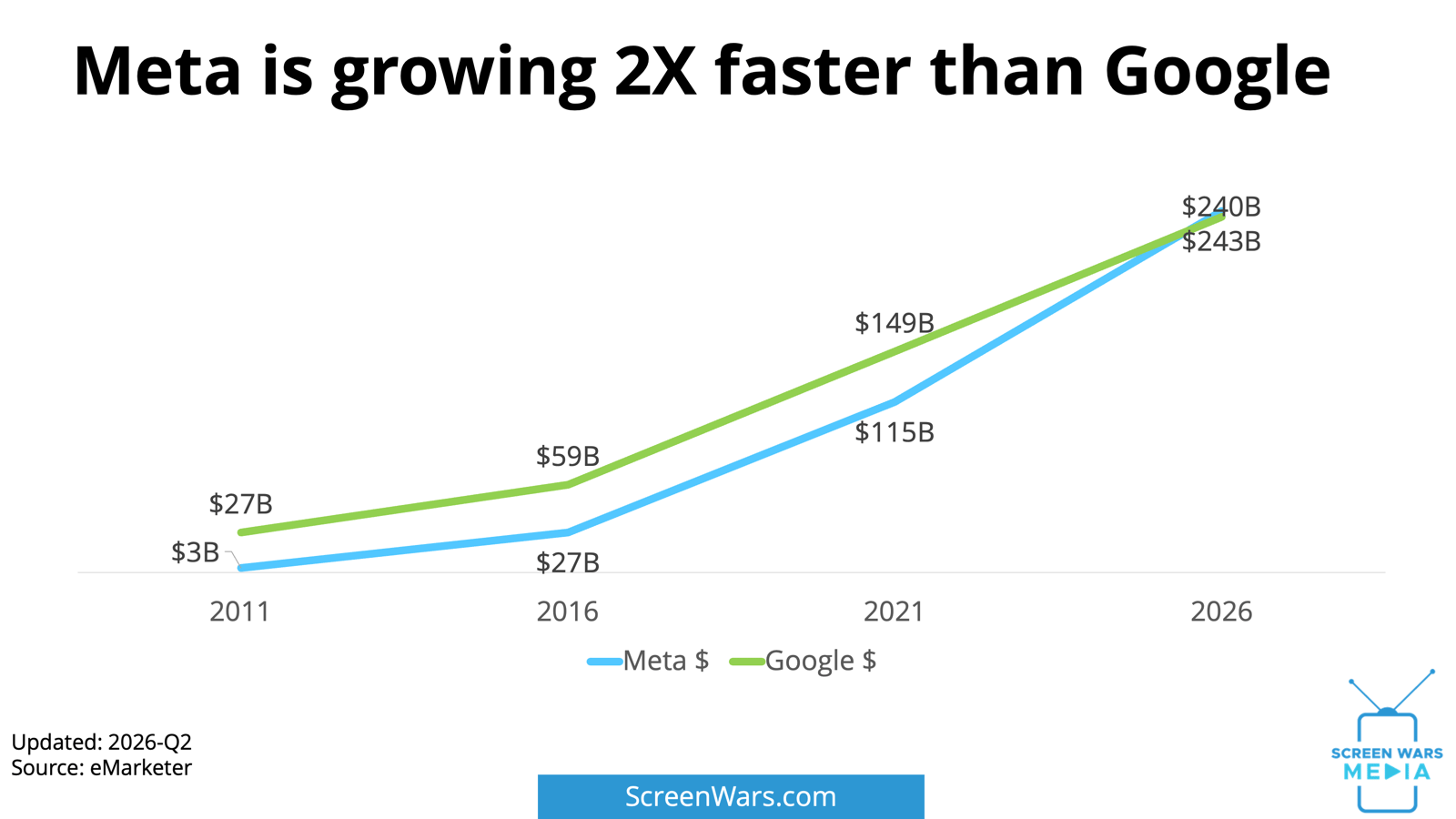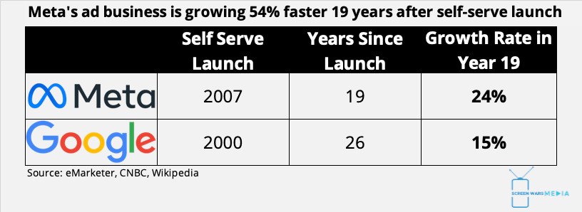 Some might say Google had a head start. Google launched self-serve ad buying in 2000, seven years before Meta (2007). So I compared how fast Google was growing 19 years after it launched self-serve. Even with that head start, Meta is growing 54% faster.