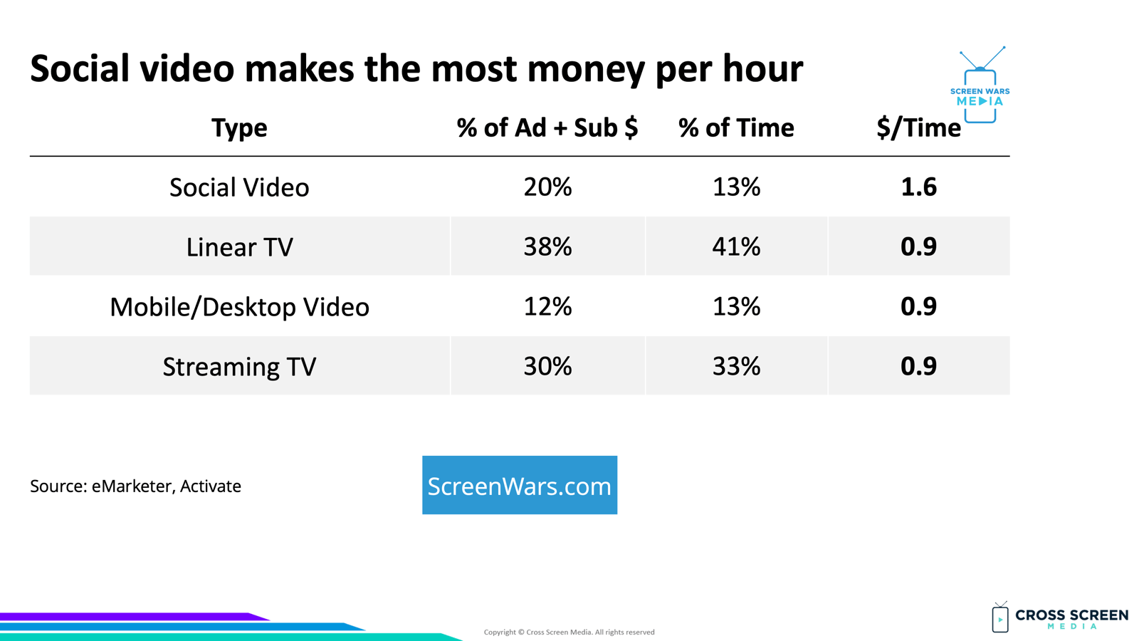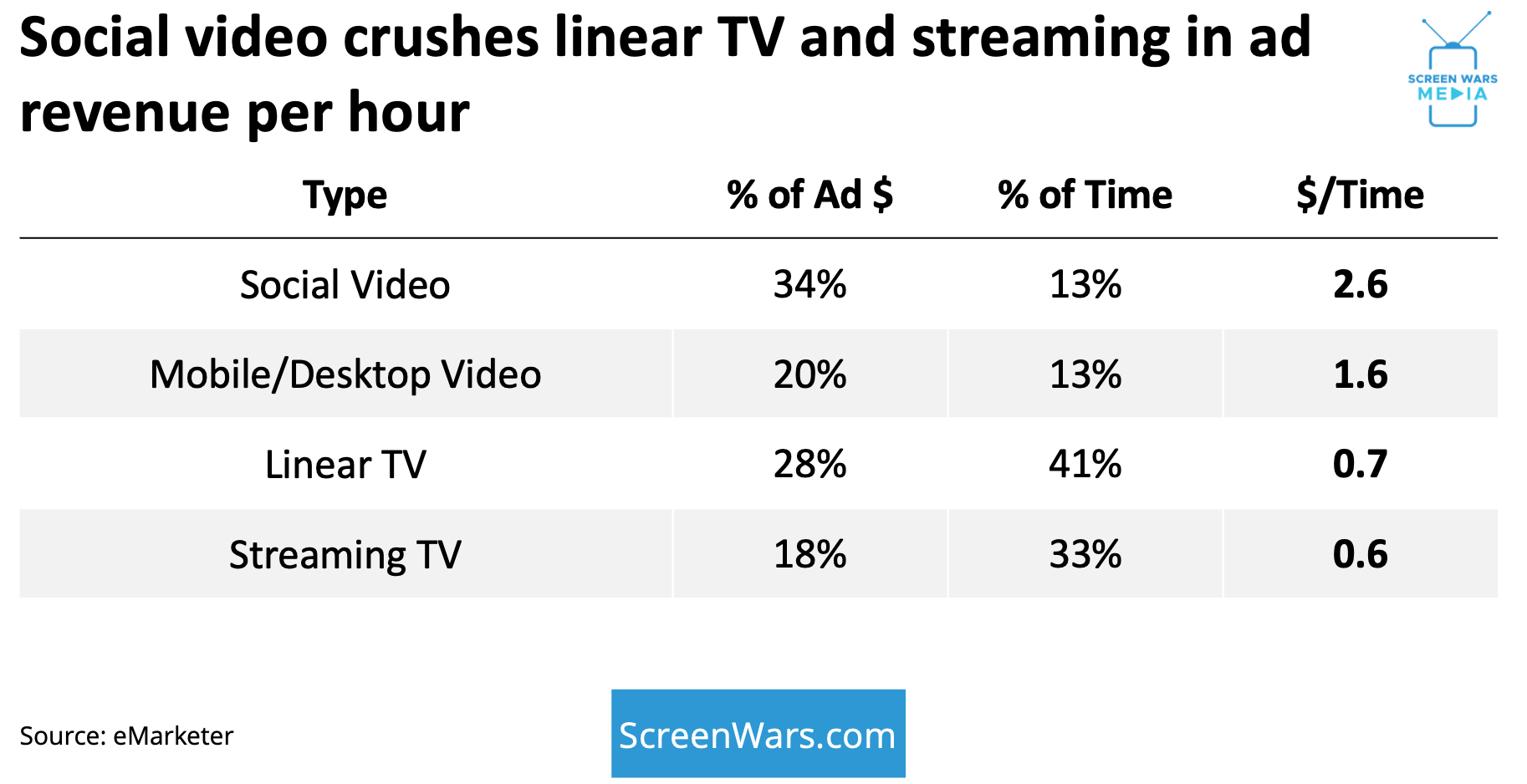 Why this matters: One hour of social video makes almost 3X more ad revenue than an hour of linear TV or streaming, and social does it with virtually no content costs.