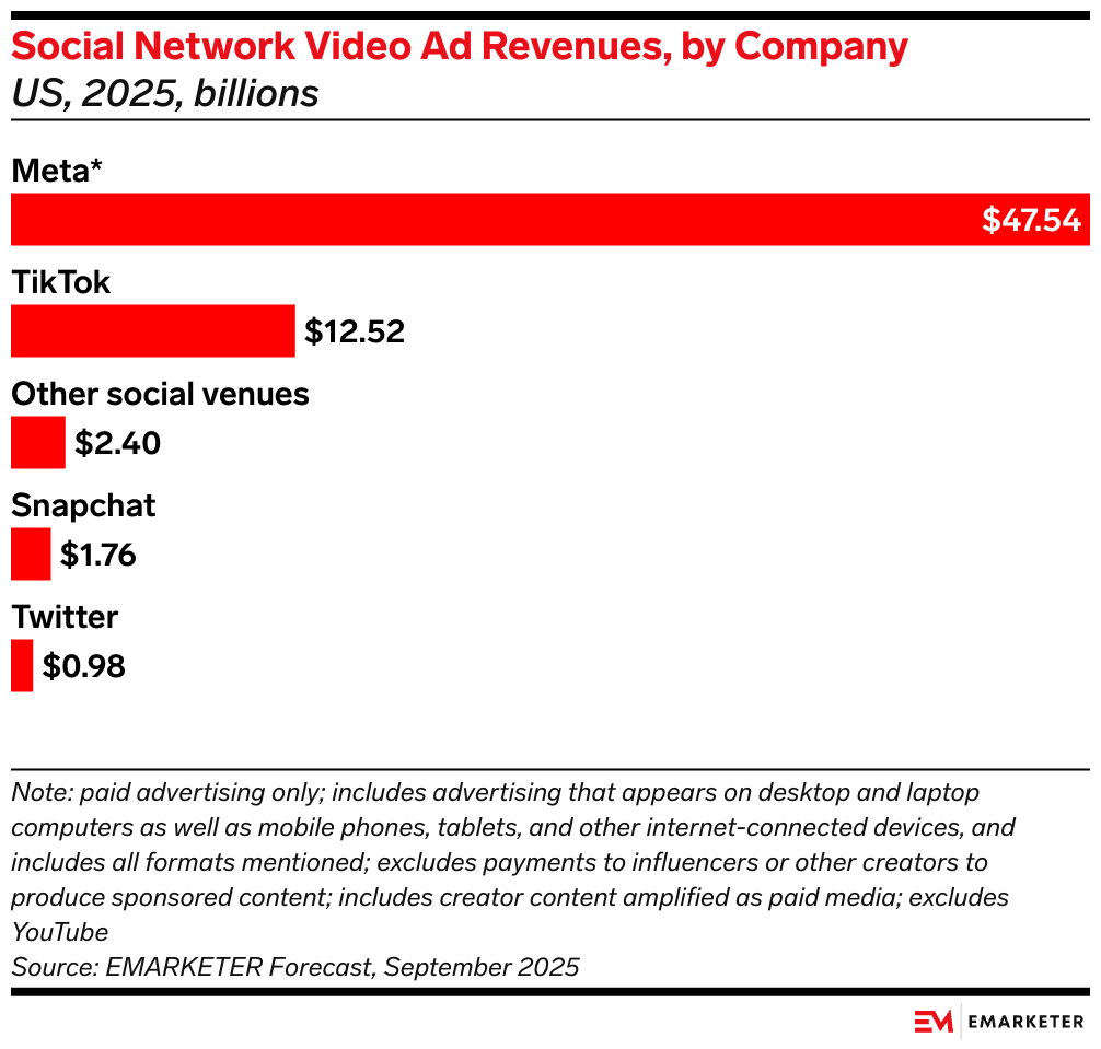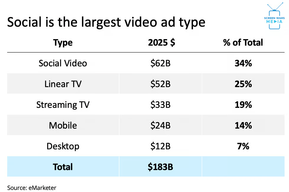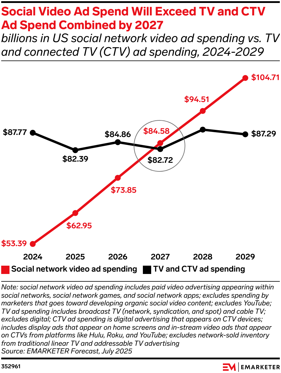 eMarketer projects that by 2027, social video ad spend will pass the combined total for linear TV and streaming.