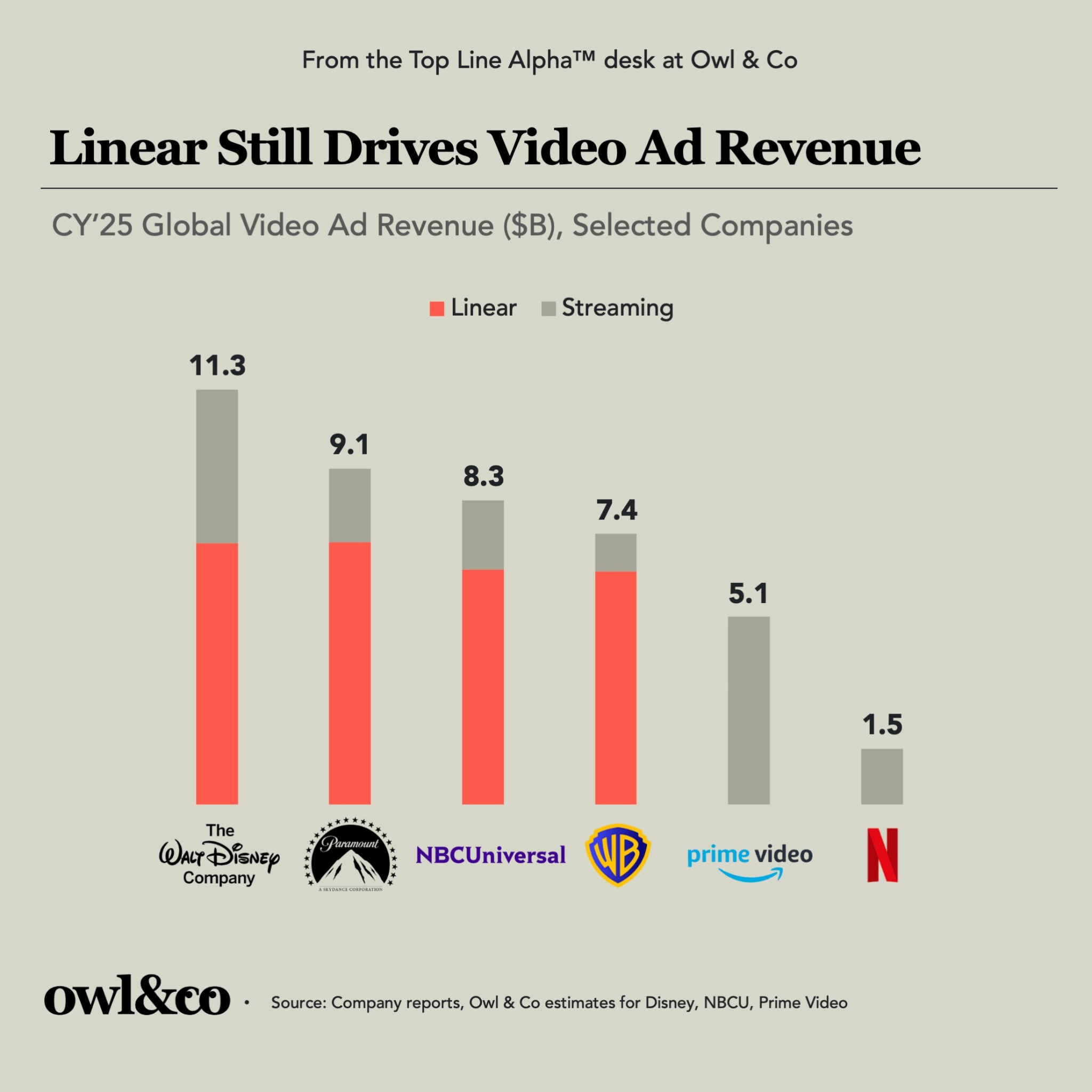 This Owl&Co chart highlights the challenge for linear natives: competing with Netflix is tough when linear still drives their economics.