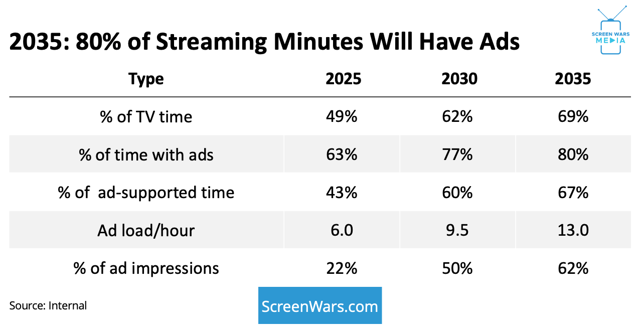 2025 is the low point for TV ad impressions. By 2035, we will be 11% off of our peak before ad-free streaming took off.